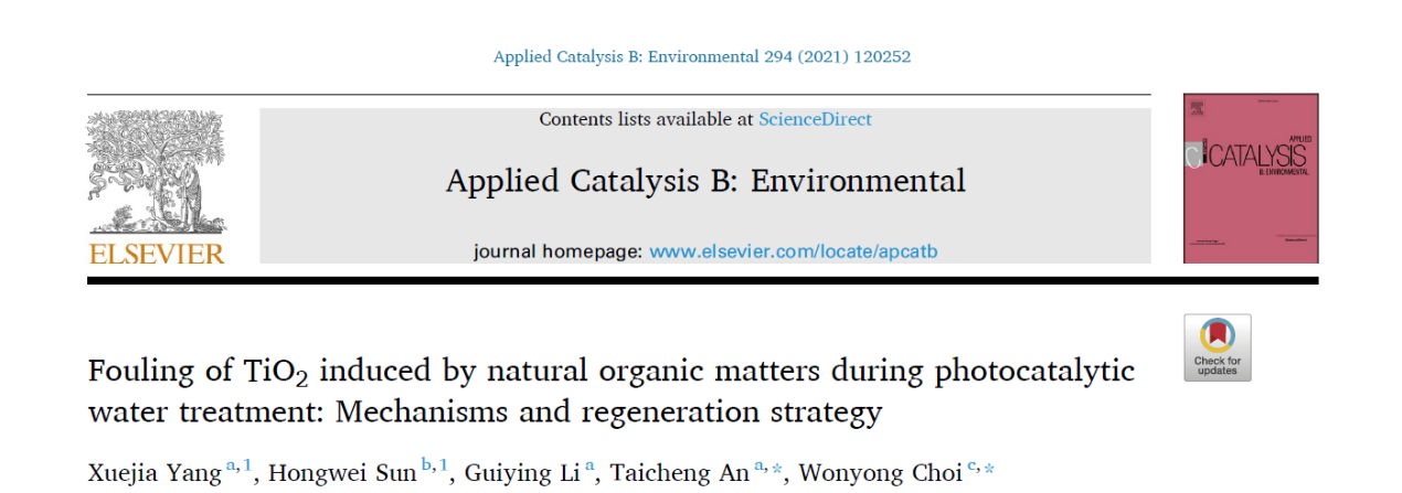 近日,广东工业大学环境健康与污染控制研究院、环境科学与工程学院安太成教授团队题为《Fouling of TiO2 induced by natural organic matters during photocatalytic water treatment: Mechanisms and regeneration strategy》的学术论文在Applied catalysis B: Environment(ACB,294(2021)120252)杂志上发表。论文的第一作者为杨雪佳硕士生和孙红卫博士,通讯作者为安太成教授和Wonyong Choi教授。该研究主要关注光催化技术在水相长期运行过程中光催化剂的失活问题,以TiO2为模型光催化剂,研究其在腐殖酸存在下废水处理中的耐久性,同时对失活TiO2再生进行了系统的研究。该研究为解决光催化技术在深度水处理中光催化剂的失活过程和机制提供了基础资料。
