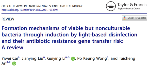 近日,广东工业大学环境健康与污染控制研究院、环境科学与工程学院安太成教授团队题为《Formation mechanisms of viable but nonculturable bacteria through induction by light-based disinfection and their antibiotic resistance gene transfer risk: a review》的综述性论文在Critical Reviews in Environmental Science and Technology (CREST,http://dx.doi.org/10.1080/10643389.2021.1932397)杂志上发表。论文的第一作者为博士研究生蔡仪威,第二作者为硕士研究生刘建莹,通讯作者为安太成教授和李桂英教授。该综述全面系统地阐述了污水消毒领域活的不可培养细菌方面的最新研究进展和挑战,综述内容包括活的不可培养细菌的分析方法、基本形态和生理特征、健康风险和环境应用等领域。同时论文还系统总结了光消毒技术与其它处理条件对活的不可培养细菌的诱导作用机制,解释了活的不可培养细菌对污水消毒领域带来的可能危害。该综述还重点关注了活的不可培养细菌迁移转化过程中潜在的耐药基因的水平转移概率与耐药性传播的健康风险,为抗生素耐药性的传播和扩散提供了新的见解。