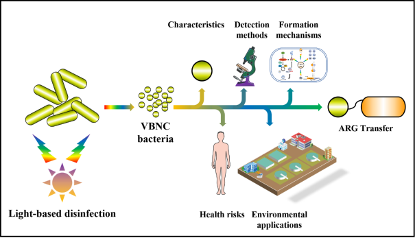 Disinfection technologies, especially light-based disinfection, have undergone tremendous development and innovation, but this treatment can cause bacteria to enterviable but nonculturable (VBNC) state. Due to their strong tolerance, VBNC bacteria cannot be completely removed by disinfection technologies, thereby posing a potential risk for antibiotic resistance gene (ARG) transfer. Therefore, to better understand VBNC bacteria and interpret potential transfer of ARGs, this article systematically reviewed changes in morphology, physiology and virulence of bacteria after entering VBNC state. In addition, this article reviewed quantitative detection methods of VBNC bacteria, such as cell membrane integrity-mediated LIVE/DEAD Baclight assay, qPCR-based assays, and phage-based detection methods, concluding that there is still a lack of in-situ and real-time detection methods forVBNC bacteria. Health risks and environmental application value of VBNC bacteria were then valuated, with data indicating that VBNC bacteria have great value in the domain of microbial utilization. Furthermore, the induction conditions (especially by light-based disinfection) and formation mechanisms of VBNC bacteria were highlighted. Formation mechanisms mainly involve stringent response, general stress response system and toxin-antitoxin (TA) system. Moreover, horizontal gene transfer (HGT) of ARGs during and after the formation of VBNC bacteria induced by light-based disinfection was evaluated. It was found that ARGs may be transferred through conjugation, transformation and transduction. Finally, current deficiencies and future challenges for the transformation of VBNC bacteria, especially those influenced by light-based disinfection technologies, were summarized.This review provides new insights into detection methods, formation mechanisms, environmental applications and potential ARG transfer risks ofVBNC bacteria.