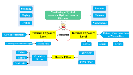 Commercial cooking has higher intensity and more severe instantaneous cooking pollution from volatile organic chemicals compared to home cooking, making health risk assessment of occupational exposure for chefs a priority. In this study, chefs from three cooking styles of kitchens, including steaming, frying, and grilling, were selected to investigate the external and internal exposures, health risks and effects of several typical aromatic hydrocarbons (benzene, toluene and naphthalene). Naphthalene was found to be the most concentrated contaminant in air samples among the different kitchens, while benzene had the lowest concentration. The concentration of toluene in frying kitchens was significantly higher than that in steaming kitchens. Air concentrations of toluene in frying kitchens, as well as benzene concentrations in grilling kitchens exceeded the standard level according to indoor air quality standard (GB/T18883-2002). Regarding the metabolites of pollutants in urine, the content of S-benzylmercapturic acids (S-BMA) for frying chefs was significantly higher than that for other cooking styles of chefs, which was consistent with the relatively higher air concentrations of toluene. There was a good correlation between internal and external exposure of the pollutants. The level of oxidative stress was influenced by 2-hydroxynaphthalene (2-OHN) and S-BMA, indicating the potential health risks of these occupational exposed chefs. This study indicates the need to improve the monitoring of typical aromatic hydrocarbons, as well as to investigate their potential health effects in large-scale groups, and improve the ventilation in kitchens.
