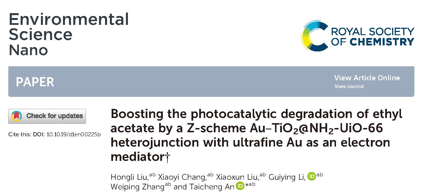 近日,广东工业大学环境健康与污染控制研究院、环境科学与工程学院安太成教授团队题为《Boosting the photocatalytic degradation of ethyl acetate by a Z-scheme Au-TiO2@NH2-UiO-66 heterojunction with ultrafine Au as an electron mediator》的学术论文在Environ. Sci.: Nano (https://doi.org/10.1039/D1EN00225B)杂志上接受发表。论文的第一作者为刘宏利副教授,第二作者为硕士研究生常晓宜,通讯作者为安太成教授。该研究工作主要是基于光生电子空穴分离增强机制,提出Au纳米簇掺杂NH2-UiO-66包裹TiO2构建的Z型异质结光催化剂,成果实现了在可见光照射下典型VOCs的高效净化,并且进一步系统阐明了影响VOCs可见光光催化降解效率的关键因素及其降解机制。