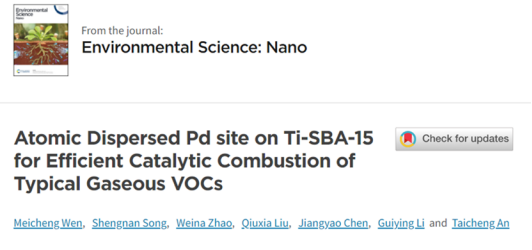 近日,广东工业大学环境健康与污染控制研究院、环境科学与工程学院安太成教授团队题为《Atomic Dispersed Pd site on Ti-SBA-15 for Efficient Catalytic Combustion of Typical Gaseous VOCs》的学术论文在Environ. Sci.: Nano 杂志上接受发表。论文的第一作者为温美成副教授,第二作者为博士研究生宋胜男,通讯作者为安太成教授。该研究工作主要是通过简单的溶剂弱还原法,制备低负载量且原子级分散的Pd负载Ti改性SBA-15分子筛催化剂,Pd的负载量仅为0.04 wt%,所制备催化剂在芳香类VOCs和烷烃/环烷烃类VOCs的催化燃烧时均展现出优异的催化活性和稳定性,通过吡啶红外光谱、VOCs程序升温脱附和密度泛函理论计算等方法,系统阐明了典型VOCs在Pd SSC/Ti-SBA-15表界面上降解的关键影响因素及其动力学反应机制。本研究对研发高效低成本催化剂及典型化工行业有机废气治理具有重要的指导意义。