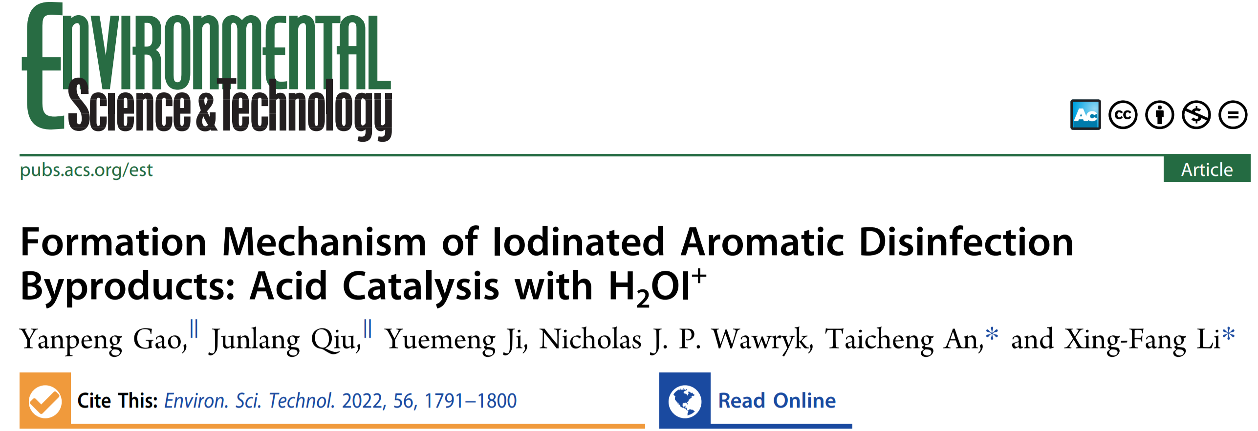 近日,广东工业大学环境健康与污染控制研究院、环境科学与工程学院高艳蓬教授、安太成教授和加拿大阿尔伯特大学Xing-fang Li教授等在消毒副产物形成机制研究方面取得新进展,研究成果以《Formation Mechanism of Iodinated Aromatic Disinfection Byproducts: Acid Catalysis with H2OI+为题发表在Environmental Science & Technology(2022, 56(3): 1791–1800)杂志上。该研究重点针对高毒性碘化消毒副产物(I-DBPs)形成机制不明晰的问题,采用量子化学计算与实验研究相结合的研究手段,从分子水平阐明了I-DBPs形成过程中H2OI+酸催化作用,为减少毒害消毒副产物I-DBPs暴露和健康影响提供了新见解。