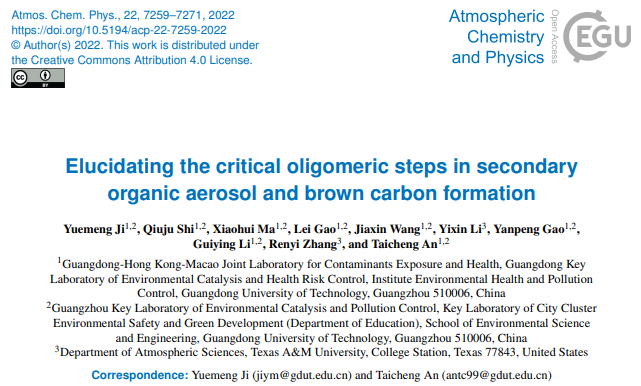 近日,广东工业大学环境健康与污染控制研究院、环境科学与工程学院安太成教授团队题为《Elucidating the critical oligomeric steps in secondary organic aerosol and brown carbon formation》的学术论文在大气化学与物理领域期刊Atmospheric Chemistry and Physics (IF2020=6.133)上发表。论文第一作者为姬越蒙教授,第二作者为石秋菊博士生,通讯作者为安太成教授和姬越蒙教授。