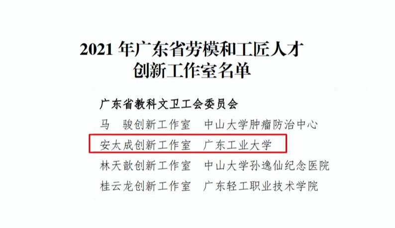 近期,广东省总工会下发《广东省总工会关于命名2021年广东省劳模和工匠人才创新工作室的决定》,广东工业大学安太成创新工作室荣获2021年广东省劳模和工匠人才创新工作室命名。