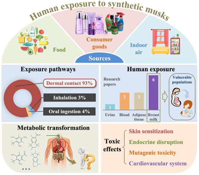 Synthetic musks (SMs) have been widely used as fragrance ingredients in various daily consumer products. Due to their mass production and usage, the presence of SMs has been reported in environmental and human biological samples, raising global concerns over human health effects. This review outlines the current knowledge on human exposure pathways and internal exposure to environmental SMs. The biotransformation of SMs in humans is also highlighted. Compared to exposure through inhalation and oral ingestion pathways, dermal contact from SMs-containing personal care products is the dominant pathway, accounting for 82–93% of total human SMs daily exposure. After penetrating the skin barrier, SMs can be absorbed by the dermis, causing potential skin irritation. Regarding internal human exposure, around half of the limited studies focused on breast milk, indicating considerable risks for vulnerable global populations (e.g. pregnant women and babies). The health effects of SMs are assessed synergistically based on the existing data and our calculated toxicological predictions. SMs could induce endocrine disruption and mutagenic toxicity according to historical analysis of data. Our computational toxicology data suggested negative impacts on the cardiovascular system for the first time. However, caution should be applied when interpreting adverse health effects using the available data, as the effective toxic doses of different SMs in laboratory studies were greater than actual environmental concentrations in most cases. Based on an analysis of research progress, this review also proposed the need to study the relationship between long-term low-dose exposure and adverse human health effects in future research.