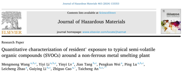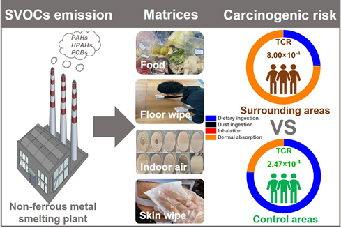 近日,广东工业大学环境健康与污染控制研究院、环境科学与工程学院安太成教授团队与河南师范大学环境学院曹治国教授联合团队在有色金属冶炼厂周边人群典型半挥发性有机污染物(SVOCs)多途径暴露的定量化研究方面取得最新研究进展,研究成果以《Quantitative characterization of resident’ exposure to typical semi-volatile organic compounds (SVOCs) around a non-ferrous metal smelting plant, JHM, 2024, 465, 133353》为题发表在Journal of Hazardous Materials期刊上。论文的第一作者为博士生王萌萌,通讯作者为曹治国教授和安太成教授。该研究报道了有色金属冶炼厂区周边居民区和对照区室内地板灰尘擦拭物、室内环境空气颗粒物、气态空气、食物(蔬菜、肉类、谷物和水果)和对应的两类人群皮肤擦拭物(手、额头和前臂)中典型SVOCs(包括多环芳烃(PAHs)、卤代PAHs(HPAHs)和多氯联苯(PCBs))的污染水平与组成特征,进而结合相应的暴露模型计算分析, 系统探究了冶炼厂周边人群对SVOCs的多途径暴露特征,综合评估了有色金属冶炼厂周边人群SVOCs暴露的潜在健康风险。该研究结果对有色金属冶炼厂周边人群SVOCs的污染控制和暴露预防具有很强的指导意义。