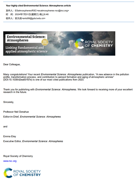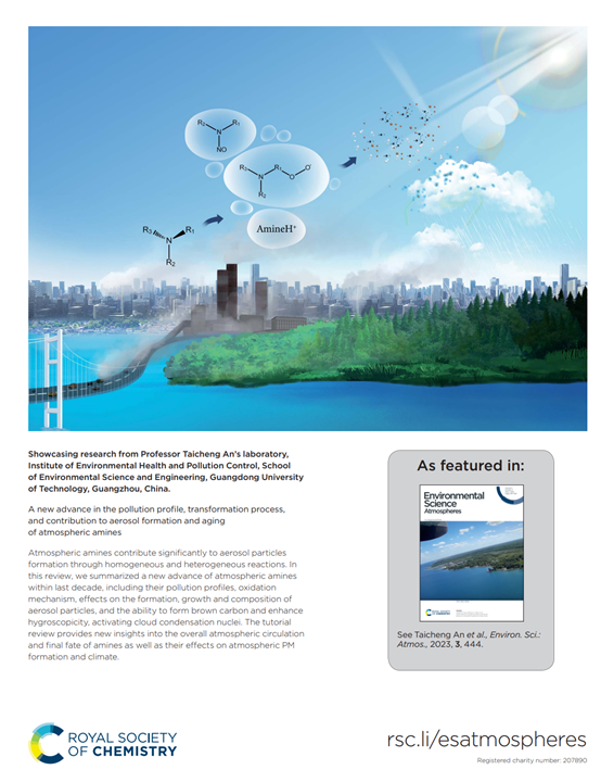 近日,作者收到编辑部的贺信,广东工业大学环境健康与污染控制研究院、环境科学与工程学院安太成教授团队发表在《Environmental Science: Atmospheres》杂志上的封面综述论文《A new advance in pollution profile, transformation process, and contribution to aerosol formation and aging of atmospheric amines, 2023, 3(3): 444-473; https://doi.org/10.1039/D2EA00167E》。该论文荣获《Environmental Science: Atmospheres》杂志自2023年以来被引用次数最多的文章之一(发表1年内引用次数超11次)。论文的第一作者为硕士生沈欣霖,通讯作者为安太成教授。