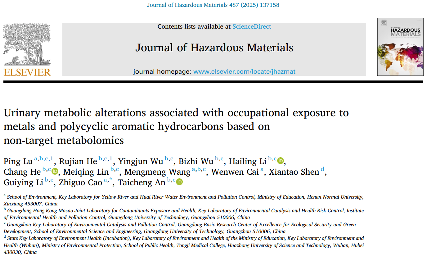 近日,广东工业大学环境健康与污染控制研究院、环境科学与工程学院安太成教授团队与河南师范大学环境学院曹治国教授联合团队在金属与多环芳烃 (PAHs)暴露导致的尿液内源性代谢变化方面取得最新研究进展,研究成果以《Urinary metabolic alterations associated with occupational exposure to metals and polycyclic aromatic hydrocarbons based on non-target metabolomics》为题发表在Journal of Hazardous Material, 2025, 487: 137158期刊 (https://doi.org/10.1016/j.jhazmat.2025.137158) 上。论文的第一作者为博士生陆平和博士后何汝坚,通讯作者为河南师范大学曹治国教授和安太成教授。该研究采用超高效液相色谱-四极杆飞行时间质谱,基于非靶标代谢组学技术识别出与金属和PAHs暴露相关的多种内源性代谢物及其相应的代谢通路。该研究结果从分子角度阐明了金属和PAHs暴露与人群不良健康结局之间的关联。