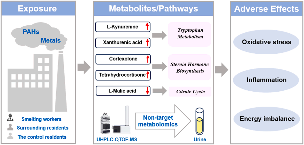 据报道,长期的职业暴露于金属和有机物会对人体健康造成极大的危害。然而,目前关于金属和多环芳烃(PAHs)暴露与人群不良健康结局之间的分子机制研究较为有限。本研究采用超高效液相色谱-四极杆飞行时间质谱对有色金属冶炼工人、工厂周边居民和对照区居民三类人群的尿液样本分别进行了非靶标代谢组学分析。通过显著性分析和相关性分析发现:与对照组相比,在冶炼工人人群中,共有22种差异代谢物与金属和PAHs暴露相关(p < 0.05)。其中,氨基酸代谢受到强烈干扰,同时发现类固醇激素生物合成、柠檬酸循环、泛酸和辅酶A生物合成等代谢通路亦受到影响。值得注意的是,类固醇激素生物合成通路的紊乱主要受PAHs暴露,尤其是羟基菲的影响 (p < 0.05)。这些受干扰的代谢通路与氧化应激、炎症和能量代谢紊乱密切相关。此外,研究结果表明周边居民的内源性代谢也在一定程度上受到有色金属冶炼活动的影响。该项工作从代谢组学的角度为金属和PAHs复合暴露引发的不良健康效应提供了重要的见解。